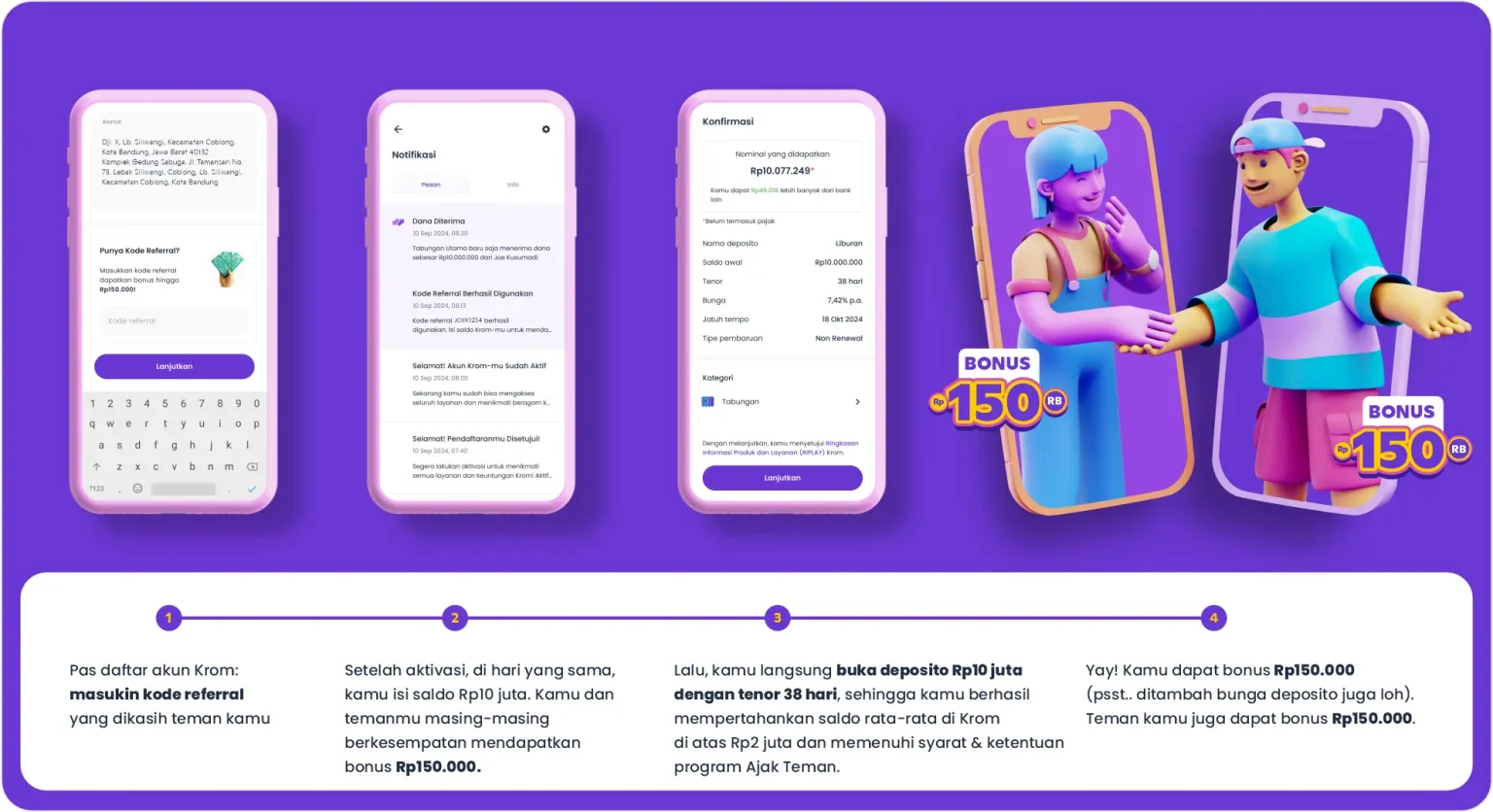 Ajak teman atau keluarga juga pakai Kode Referral Krom Bank: ERMA2152 agar benefit makin besar.